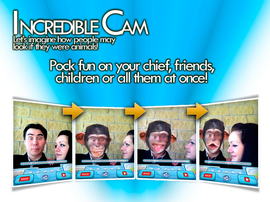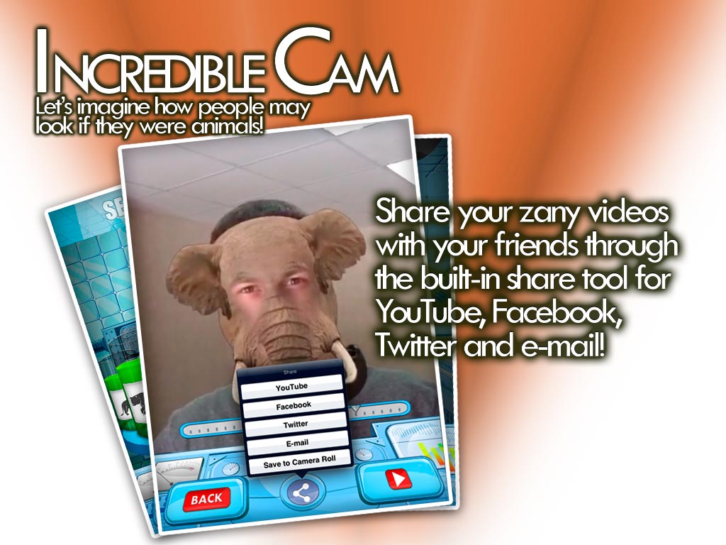Vivid, colorful and, obviously, funny Incredible Cam allows you to transform your face into various lifelike animal appearances available in the app. Incredible Cam is a must-have tool for those who like recording videos and making fun of their friends, children, and even a chief, and share their good mood via Twitter, Facebook, e-mail and YouTube.